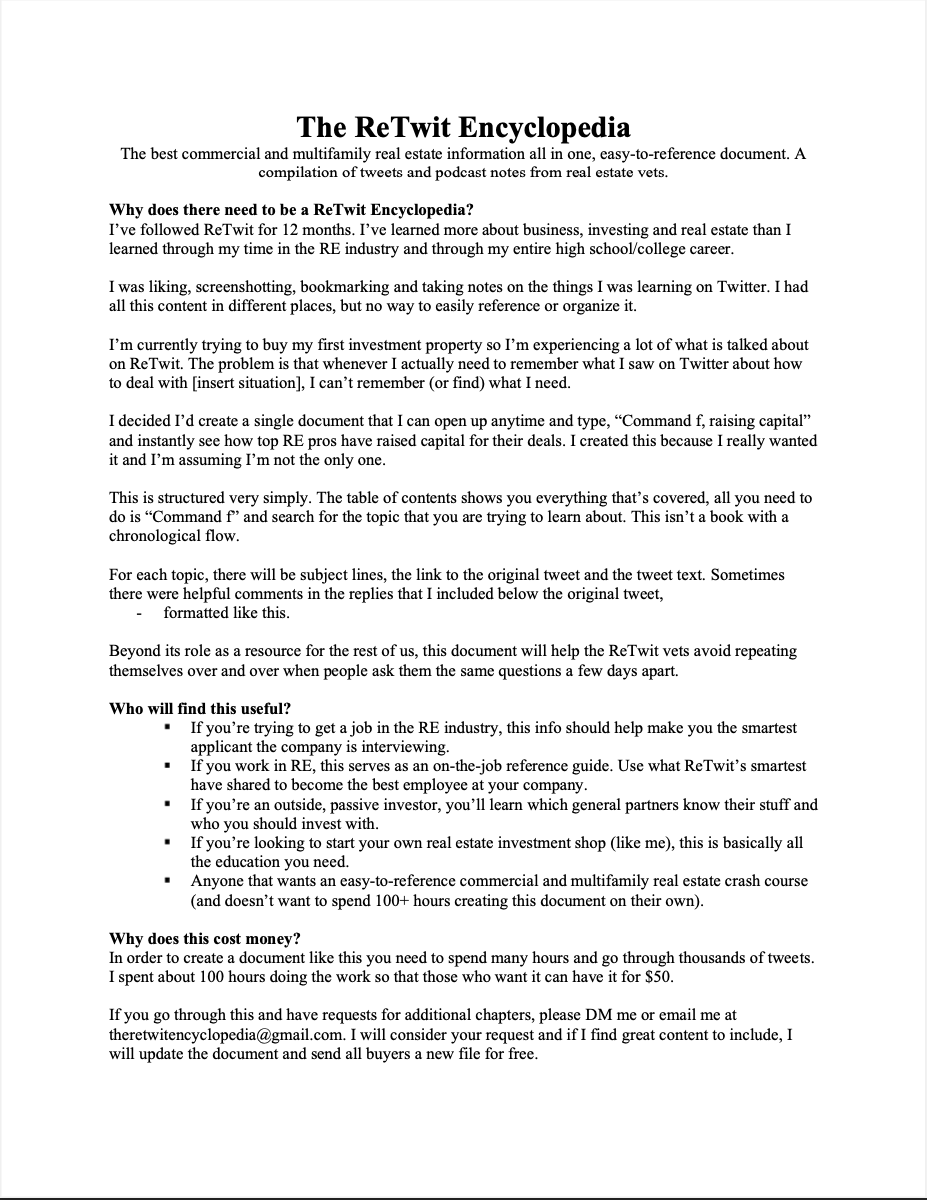 The best commercial and multifamily real estate content from ReTwit (Real Estate Twitter), wrapped up in a single document. Search by topic and instantly find multiple tips and strategies from industry veterans.